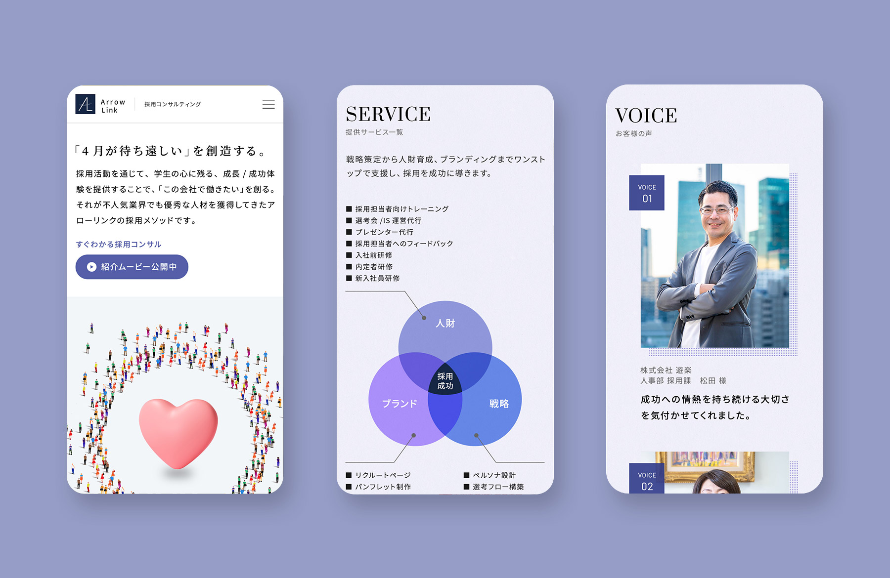 - 採用コンサルティングや人材紹介、DXコンサルティングなど様々な事業を展開するアローリンク様の採用コンサルティングを紹介するサービスサイト(LP)を作成させていただきました。採用のステップは、流れを見やすいように横スクロールで展開しており、随所に現れるハートのモチーフは応募者の企業への関心の度合いを表現しています。(ステップが進むに連れて関心の度合いが高まる)